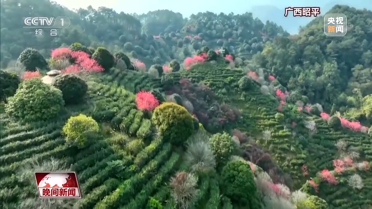 광서 하주 소평현의 차밭에는 청록색의 차나무와 분홍색의 복숭아꽃이 서로 어울려 멀리 바라보면 마치 분홍색의 차밭이 고산차밭을 감싸고있는것 같다.날씨가 쾌청한 것을 틈타 관광객들은 사진을 찍고 카드를 찍으며 봄기운을 느끼고 있다.